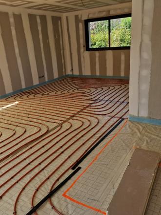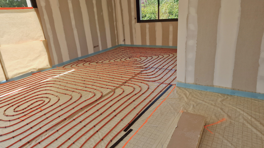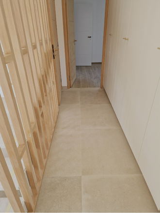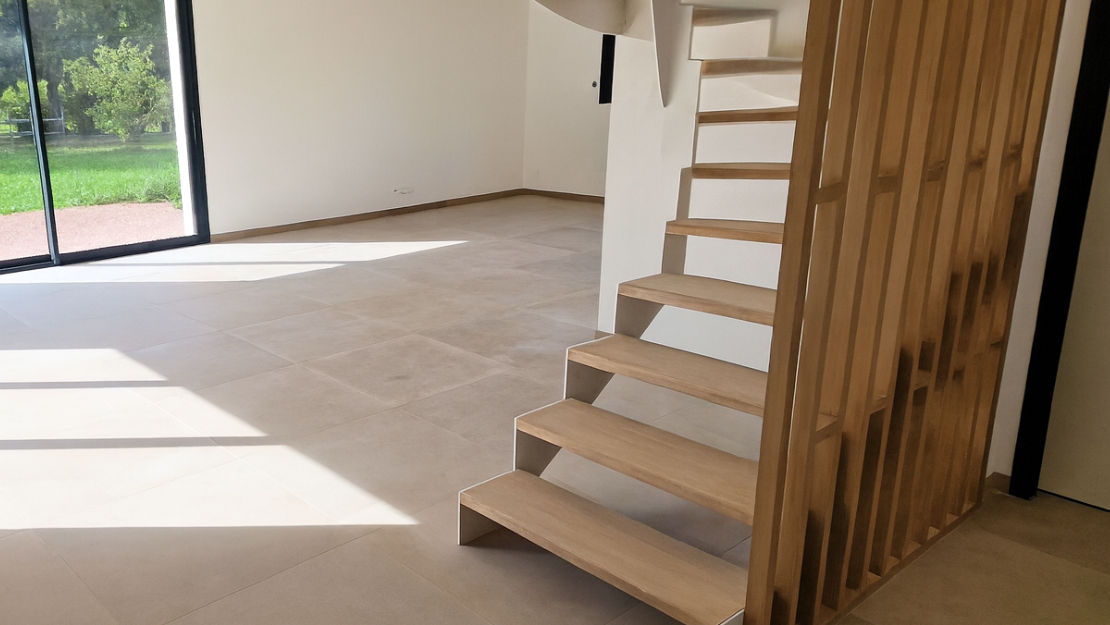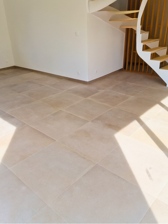 Nous avons effectué la mise en œuvre d’une chape fluide anhydrite sur plancher chauffant, permettant un enrobage complet du réseau et assurant une parfaite conductivité thermique. Un ragréage de finition a ensuite été réalisé afin d’obtenir une planéité conforme aux tolérances requises pour la pose de grands formats. Après contrôle de l’humidité résiduelle et préparation du support, nous avons procédé à la pose collée d’un carrelage grand format, avec respect des joints de fractionnement et utilisation de systèmes de nivellement pour garantir une surface plane et homogène. Cette intervention assure un sol performant, stable et durable, parfaitement compatible avec le chauffage au sol et doté d’une finition esthétique de haute qualité.