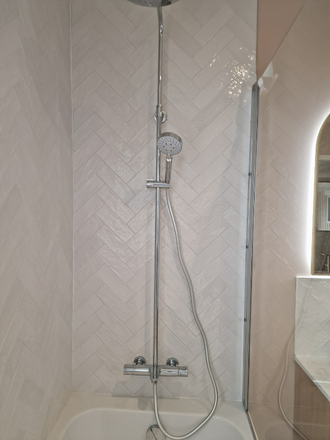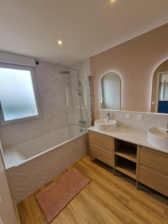 Dans cette salle de bain, nous avons réalisé la pose d’une faïence type zellige en motif bâton rompu. Ce calepinage a été appliqué sur le tablier et le mur de la baignoire, ainsi qu’en crédence au-dessus du meuble vasque. Le choix du zellige et de ce motif apporte du relief, une touche artisanale et un jeu de lumière subtils qui valorisent l’espace tout en conservant une esthétique élégante et intemporelle.