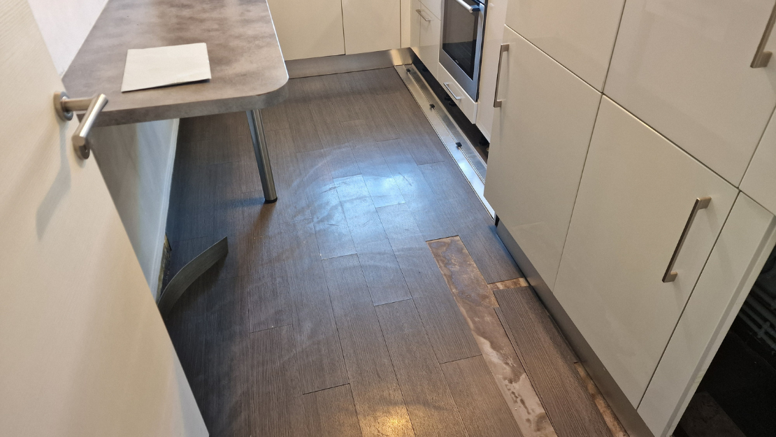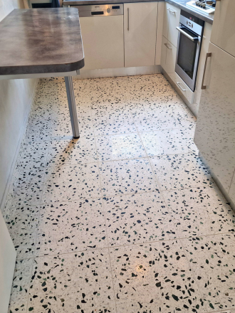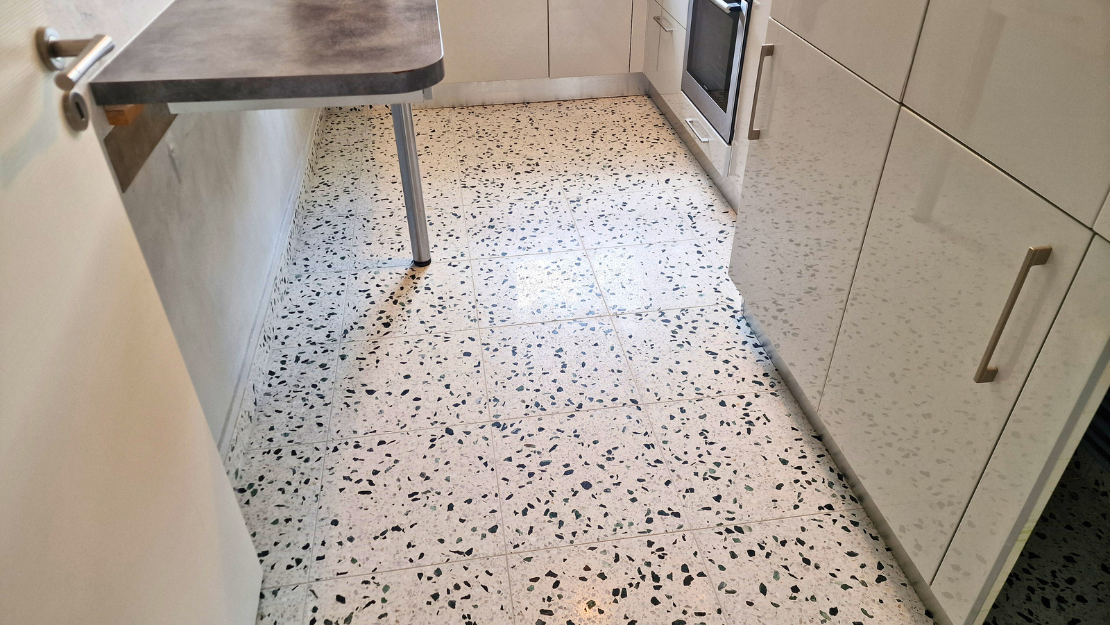 Dans cette cuisine, notre équipe a réalisé la pose complète d’un carrelage terrazzo au sol, avec un soin particulier apporté aux finitions et aux alignements. Chaque carreau a été posé avec précision pour garantir une surface plane, régulière et durable, tout en respectant l’esthétique caractéristique du terrazzo : un fond clair parsemé d’éclats noirs et verts, qui donne du caractère et de la luminosité à la pièce. Nous avons également posé des plinthes assorties dans le même matériau, permettant une transition harmonieuse entre le sol et les murs, tout en protégeant efficacement les cloisons contre les chocs et l’humidité. Ce chantier illustre parfaitement notre engagement pour un travail soigné, aussi bien sur le plan technique qu’esthétique, en assurant une intégration parfaite du carrelage dans un environnement de cuisine moderne.