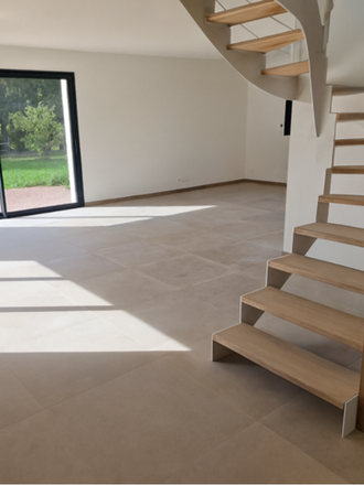 Nous avons effectué la mise en œuvre d’une chape fluide anhydrite sur plancher chauffant, permettant un enrobage complet du réseau et assurant une parfaite conductivité thermique. Un ragréage de finition a ensuite été réalisé afin d’obtenir une planéité conforme aux tolérances requises pour la pose de grands formats. Après contrôle de l’humidité résiduelle et préparation du support, nous avons procédé à la pose collée d’un carrelage grand format, avec respect des joints de fractionnement et utilisation de systèmes de nivellement pour garantir une surface plane et homogène. Cette intervention assure un sol performant, stable et durable, parfaitement compatible avec le chauffage au sol et doté d’une finition esthétique de haute qualité.